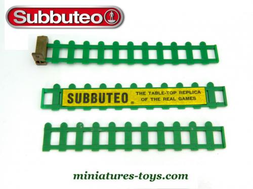 Chacune de ces barrières Subbuteo mesurant 16,5 cm de long pour 2,5 cm de haut sont réalisées en matière plastique de couleur vert et accompagné d'un poteau brun marron.