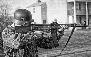 Le soldat la Waffen SS miniature reproduit ici en figurine épaulant avec son sturmgewehr 44 est revétu de sa vareuse camo, avec un pantalon gris feldgrau.