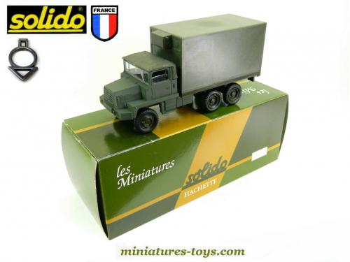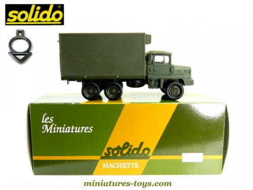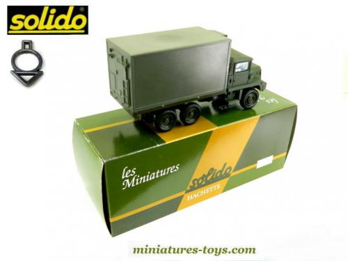 Un modèle réduit du Berliet GBC 8 Kt shelter militaire de Solido reproduit au 1/50ème mesurant 14,5 cm de long qui est réalisé en métal et matière plastique de couleur vert armée.