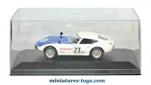 Cette voiture Shelby Toyota 2000GT miniature d'Universal Hobbies présentée vissée sur une base en matière plastique noire est à l'état neuve et dans une boite de type vitrine avec un couvercle translucide.