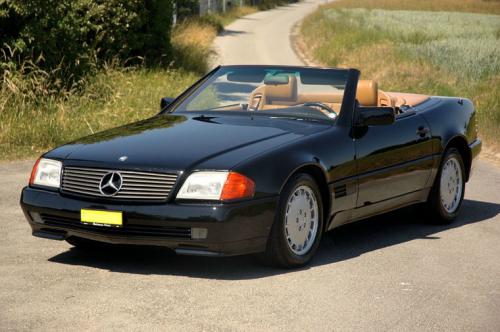 Le cabriolet Mercedes 500 SL noir de 1989 reproduit en voiture miniature par Solido au 1/43ème qui fut commercialisé en 2001 par Hachette Collections sous la référence: 56.