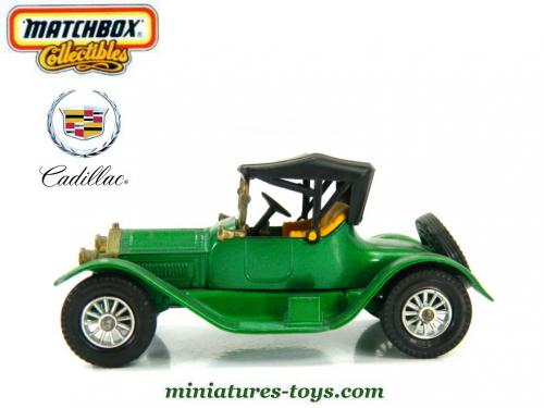 Un modèle réduit du coupé Cadillac 1913 de Lesney Matchbox au 1/48ème mesurant 8,5 cm de long qui est réalisé en métal et matière plastique avec une carrosserie couleur vert métallisé, la capote déployée est noire et la banquette brune.