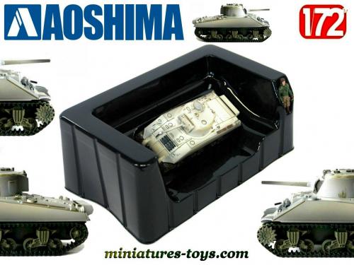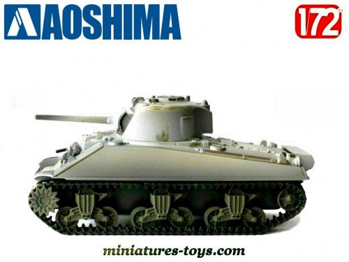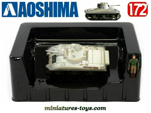 Un modèle réduit du char M4 A3 Sherman d'Aoshima au 1/72ème mesurant 8,5 cm de long qui est réalisé en métal et matière plastique avec une figurine.